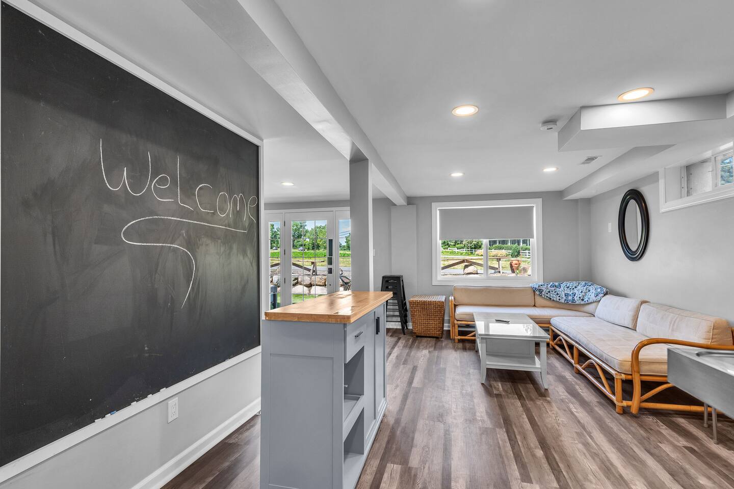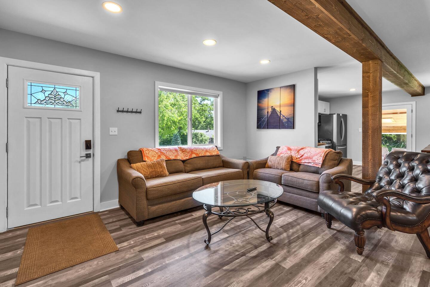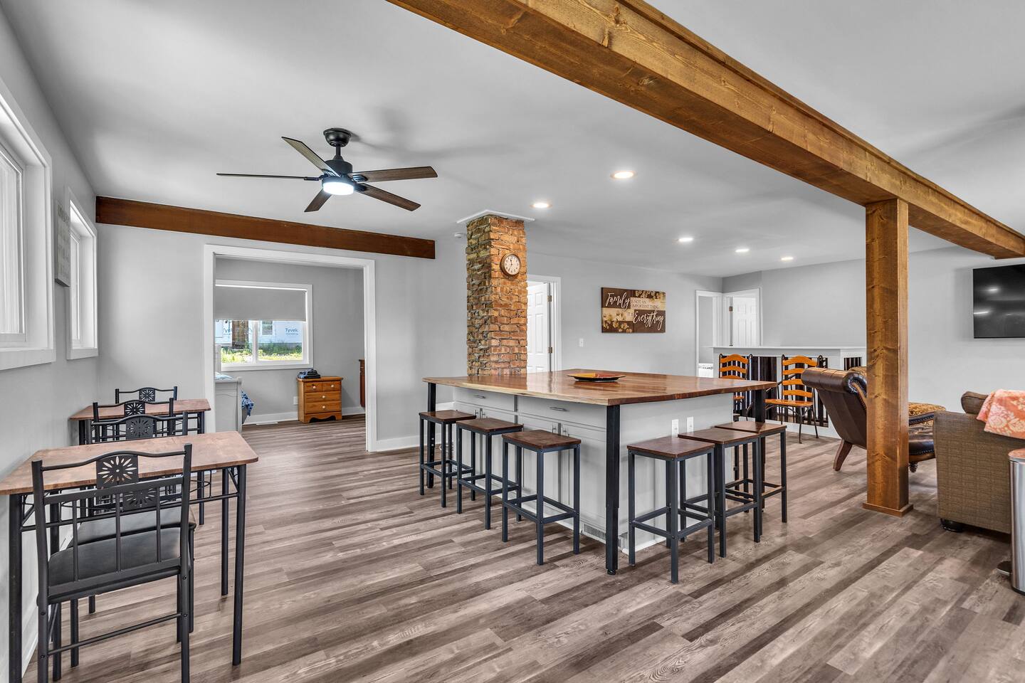 Room for Everyone – Sleeps 14 Comfortably The "Big Chill offers" 6 bedrooms and 4 full bathrooms spread across two spacious levels — perfect for large groups, multi-family stays, or special gatherings. Main Level: -Queen master bedroom with access to full bath -Queen bedroom -Twin trundle with pull-out -2 full bathrooms Upper Level: -King master suite with private bath -Bedroom 2: Queen + twin trundle with pull-out -Bedroom 3: Twin trundle with pull-out -2 full bathrooms Bonus: A cozy 3-season room with seating for 6 — ideal for morning coffee, game nights, or wine chats. Indoor Comfort Meets Outdoor Living Chef’s kitchen with hardwood countertops + oversized island Generous seating indoors & out for group meals 2 Weber gas grills + brand-new wood-fired pizza oven Spacious 15x30' outdoor patio Solo Stove fire pit inside a grain-bin gazebo + an open-air fire pit Lower-level kitchenette with fridge, freezer & microwave Fun & Unique Amenities You Won’t Find Anywhere Else Private 5-hole mini golf course -Cornhole, frisbee golf net, volleyball setup (on request) -Grain-bin gazebo with 55” Smart TV & stereo -Indoors: 70” + 65” Smart TVs, board games, books & cozy lounges -Adventure-Ready for All Ages -6 bikes with helmets (more on request) -Kayaks with paddles & life vests (reserve in advance) -4 luxury lake floats -Fishing gear provided — fish off the public shoreline just 2 blocks away -Coolers + wagon for your lake day convenience -Boat rental/charter options nearby — including pickup from Hillside Road public beach (just a short walk away) **If you choose to use any of the outdoor amenities or activities the host and co-hosts are not held liable.**